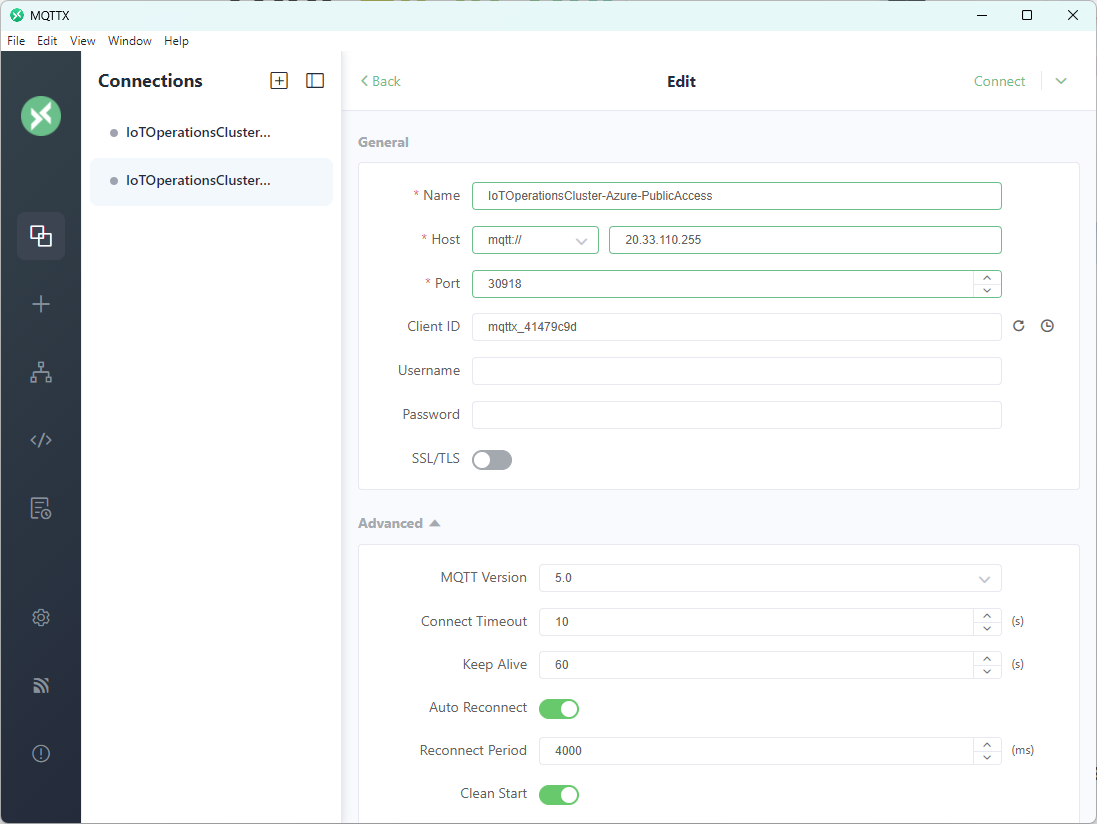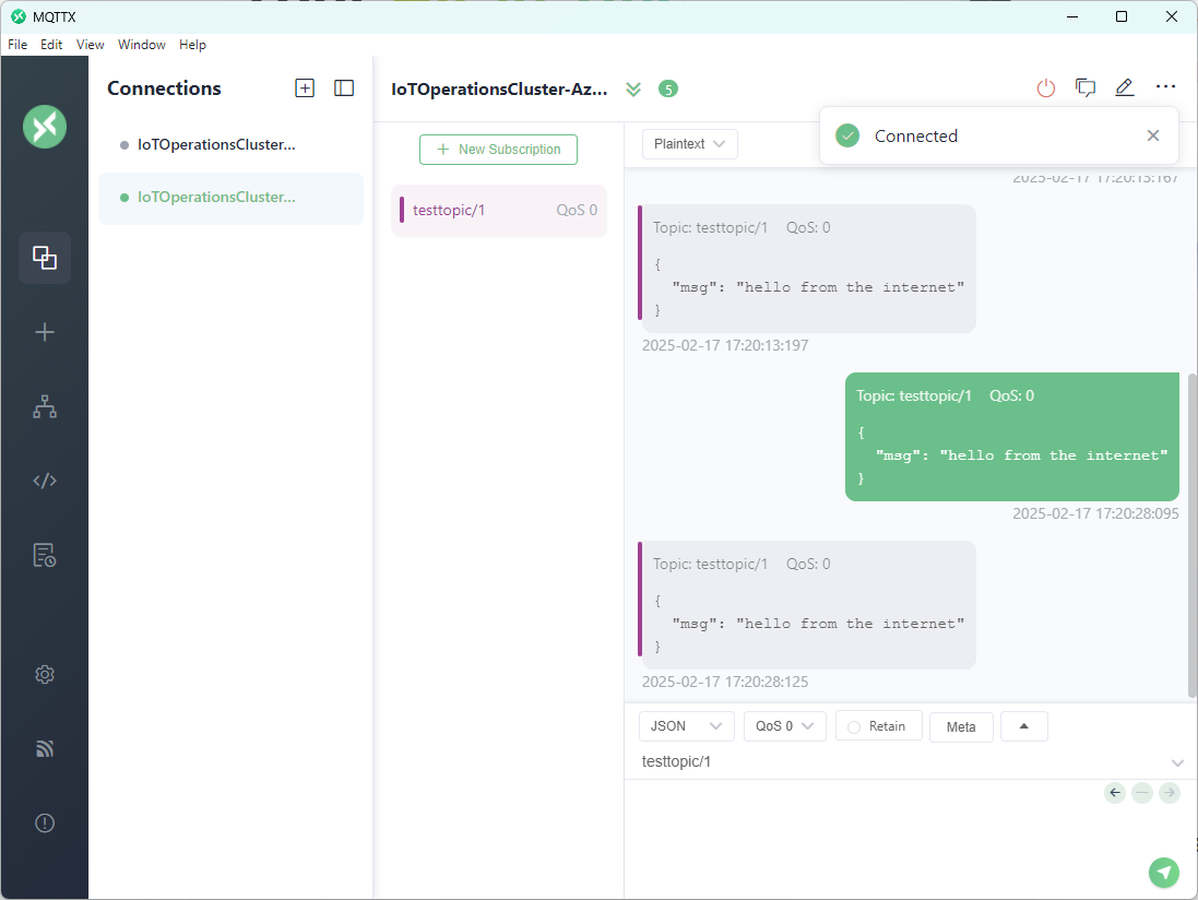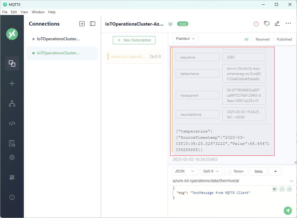 Abschließend verbinde ich mich mit einem MQTT Client (MQTTX) mit dem MQTT Broker von Azure IoT Operations und subscribe auf das entsprechende MQTT Topic: