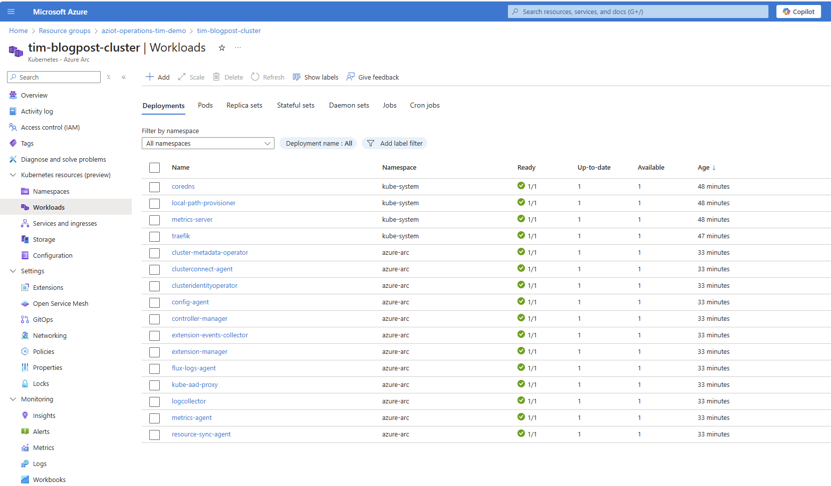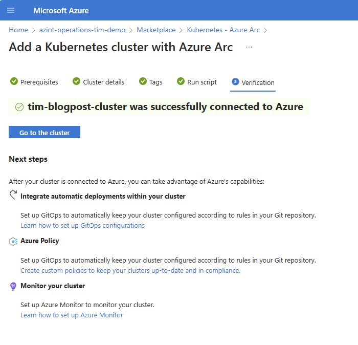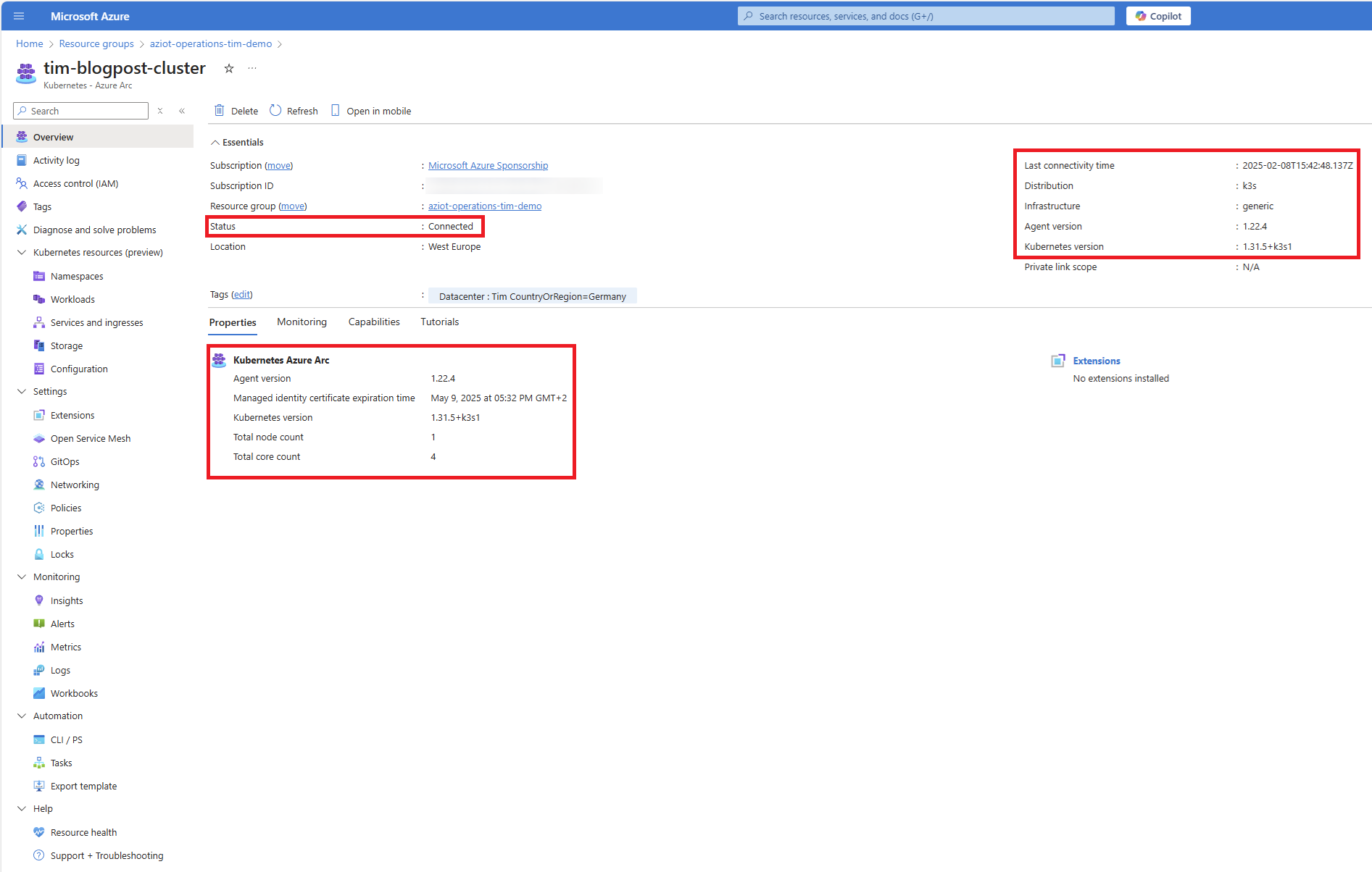 Nach der erfolgreichen Registrierung läuft ein Azure Arc-Agent auf dem Cluster, der die Verwaltung über Azure ermöglicht.