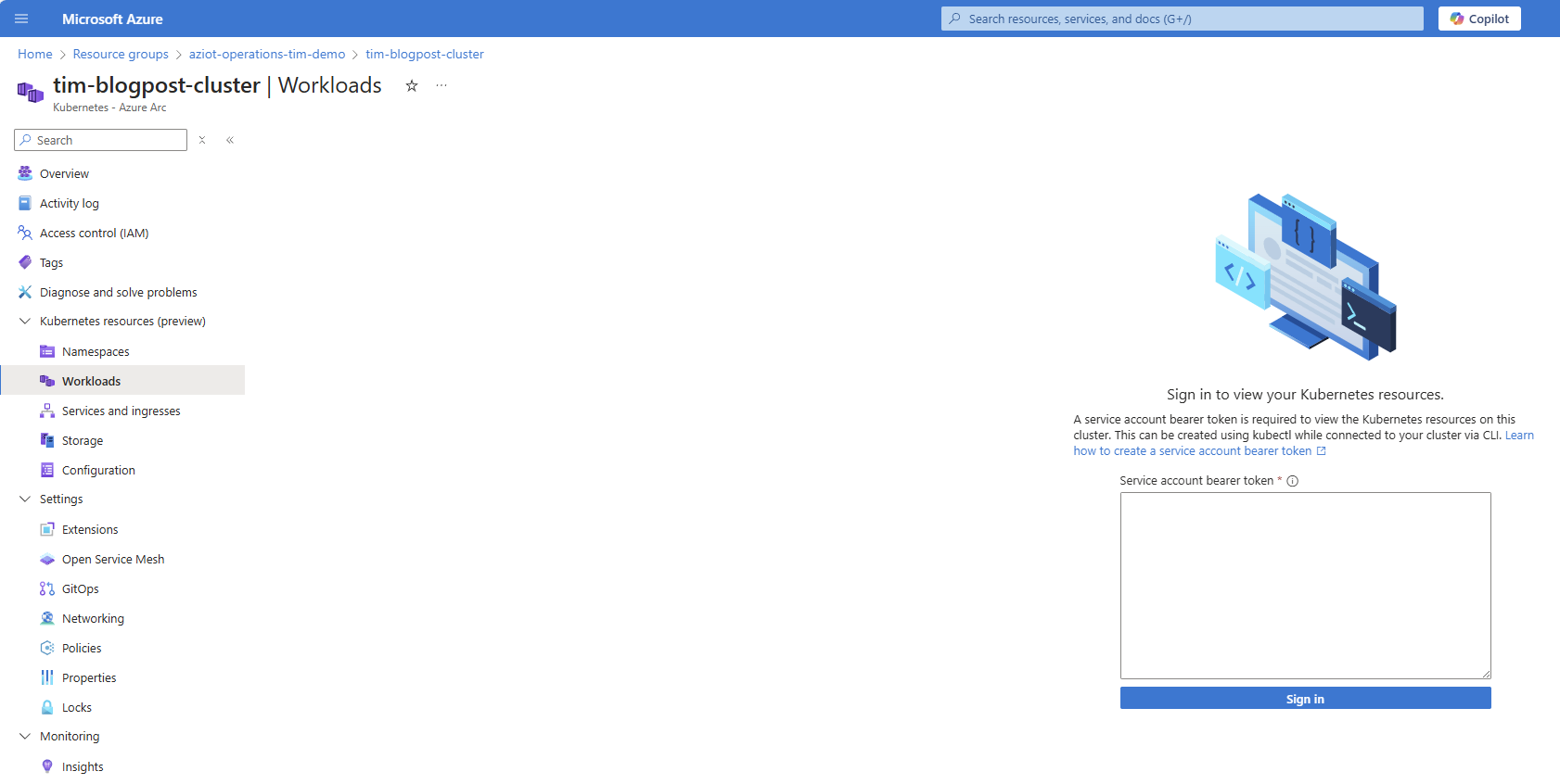 Azure Arc ermöglicht die Verwaltung von Kubernetes-Ressourcen direkt im Azure-Portal (aktuell in Preview). Dazu wird ein Service Account Bearer Token benötigt.