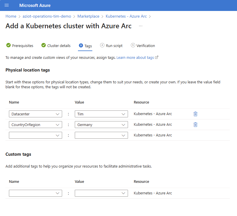 az connectedk8s connect --name "MeinCluster" --resource-group "<Ressource_Group_Name>" --location "westeurope" --correlation-id "<Correlation_ID>" --tags 'Datacenter=Tim CountryOrRegion=Germany'Installationsskript für einen Arc connected Kubernetes Cluster