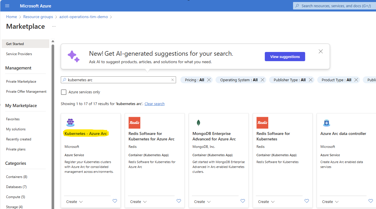 az group create --name AzureArcTest --location WestEurope --output tableAnschließend wird eine neue Ressource angelegt. Dafür kann im Suchfeld z.B. nach "kubernetes arc" gesucht werden.