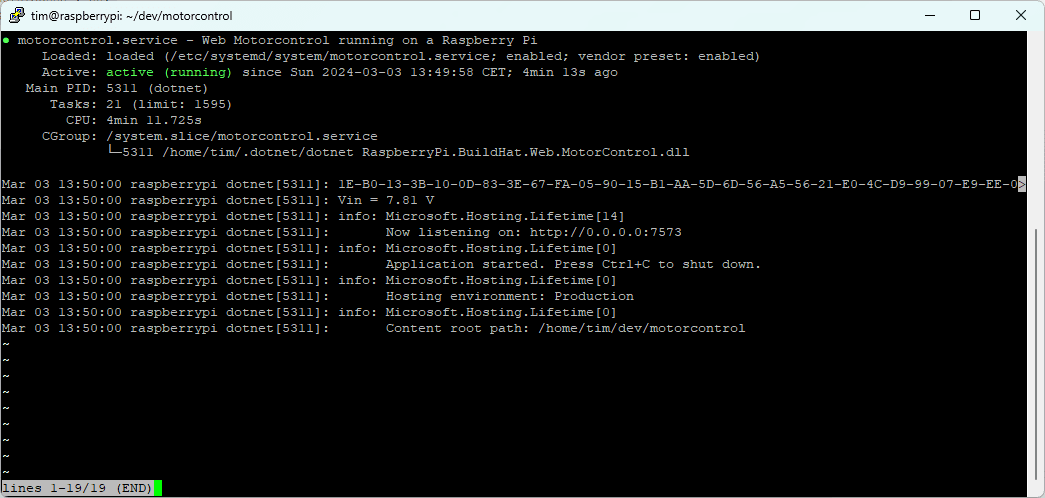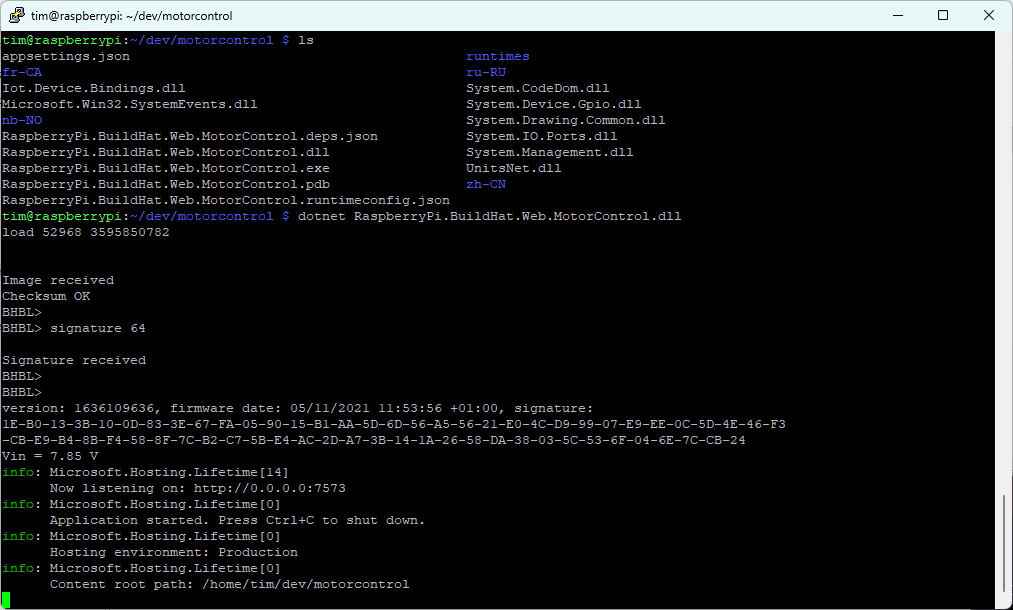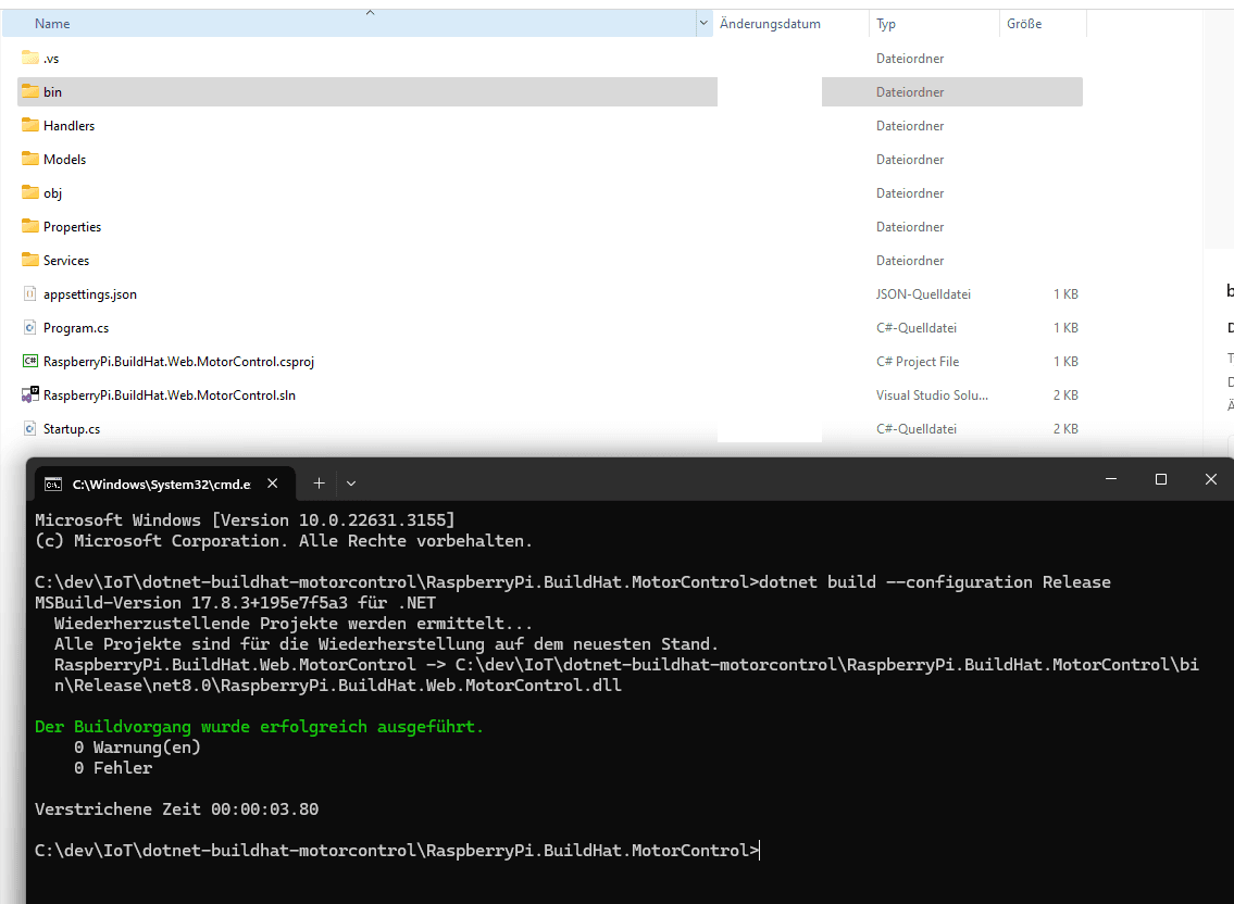 Für einen ersten Test könnt ihr das Programm mit dem Befehl dotnet RaspberryPi.BuildHat.Web.MotorControl.dll ausführen: