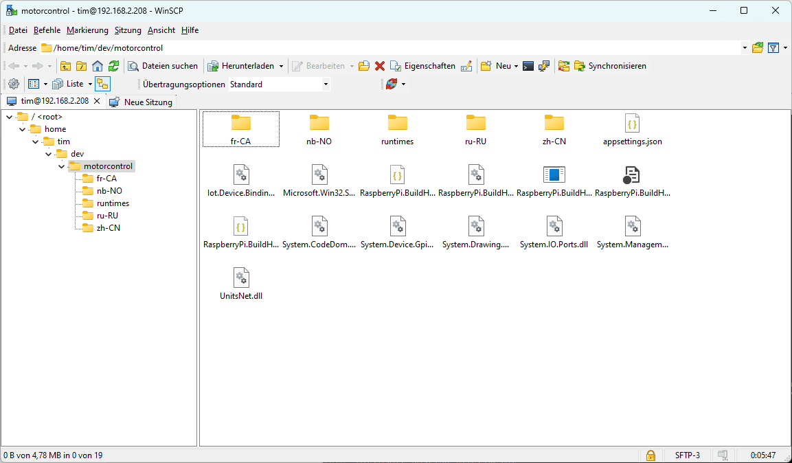 Kopiert nun dieses Verzeichnis auf euren Raspberry Pi. Dazu könnt ihr ein Programm wie WinSCP verwenden, um eine Verbindung mit dem Dateisystem des Raspberry Pi herzustellen. Anschließend kopiert ihr den gesamten Inhalt in einen geeigneten Pfad auf dem Raspberry Pi. In meinem Fall ist das /home/tim/dev/motorcontrol.